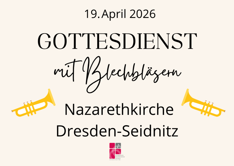 Am 19. April 26 um 10 Uhr laden wir in die Nazarethkirche Dresden-Seidnitz zum Gottesdienst ein. Dieser wird von Blechblasschüler*innen der Evangelischen Musizierschule, sowie einem Orgelschüler ausgestaltet.