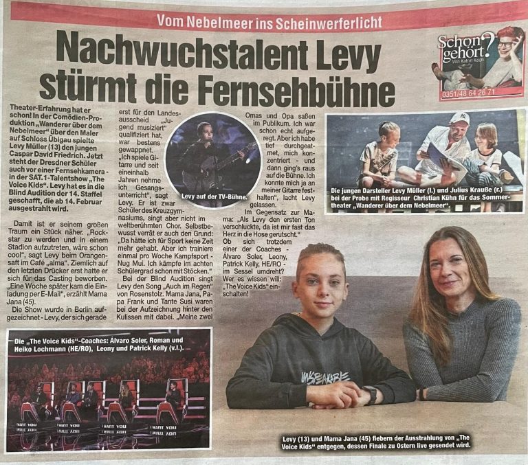 Levy Müller, der an der Evangelischen Musizierschule Gesangs- und Gitarrenunterricht bekommt, stellte sich schon bei Jugend Musiziert der Bewertung der Jury und erlangte in seiner Altersklasse einen 1. Platz mit Weiterleitung zum Regionalwettbewerb. Nun ist er auch bei „The Voice Kids“ in die Blind Auditions gekommen und steht damit vor einer Fernsehkamera der Sat1 Show. Die 14. Staffel wird ab dem 14. Februar ausgestrahlt. Wir drücken Levy natürlich die Daumen, dass sich mindestens einer der Coaches von „The Voice Kids“ für ihn umdreht.