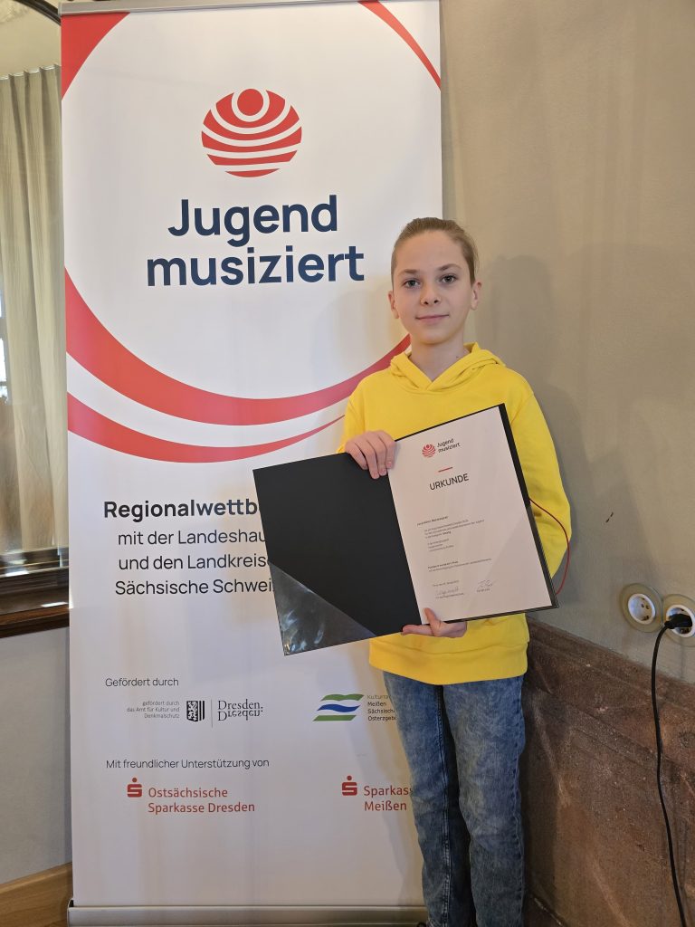 Levy Müller hat erneut einen 1. Platz mit Weiterleitung zum Bundeswettbewerb im Fach Gesang erhalten. Der Auftritt vor der Jury fand am 15.03.26 in Zwickau statt. Wir freuen uns mit ihm, seiner Familie, seiner Gesangslehrerin Katrin Pehla- Döring und seinem Korrepetitor Clemens Weinhold über diese unglaubliche Leistung und wünschen alles Gute für den Bundeswettbewerb im Mai 2026. Zudem erhielt Sophia Richter einen 2. Platz mit 22 Punkten. Auch ihr gratulieren wir ganz herzlich zu ihrer Leistung, die sie in Zwickau gezeigt hat.